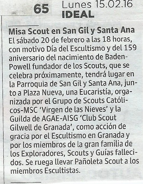 En el diario IDEAL, lunes 15-2-2016, página 65: «Misa Scout en San Gil y Santa Ana El sábado 20 de febrero a las 18 horas, con motivo Día del Escultismo y del 159 aniversario del nacimiento de Baden-Powell fundador de los Scouts, que se celebra próximamente, tendrá lugar en la Parroquia de San Gil y Santa Ana, junto a Plaza Nueva, una Eucaristía, organizada por el Grupo de Scouts Católicos-MSC ‘Virgen de las Nieves’ y la Guilda de AGAE-AISG ‘Club Scout Gilwell de Granada’, como acción de gracia por el Escultismo en Granada y por los miembros de la gran familia de los Exploradores, Scouts y Guías fallecidos. Se ruega llevar Pañoleta Scout a los miembros Escultistas».-